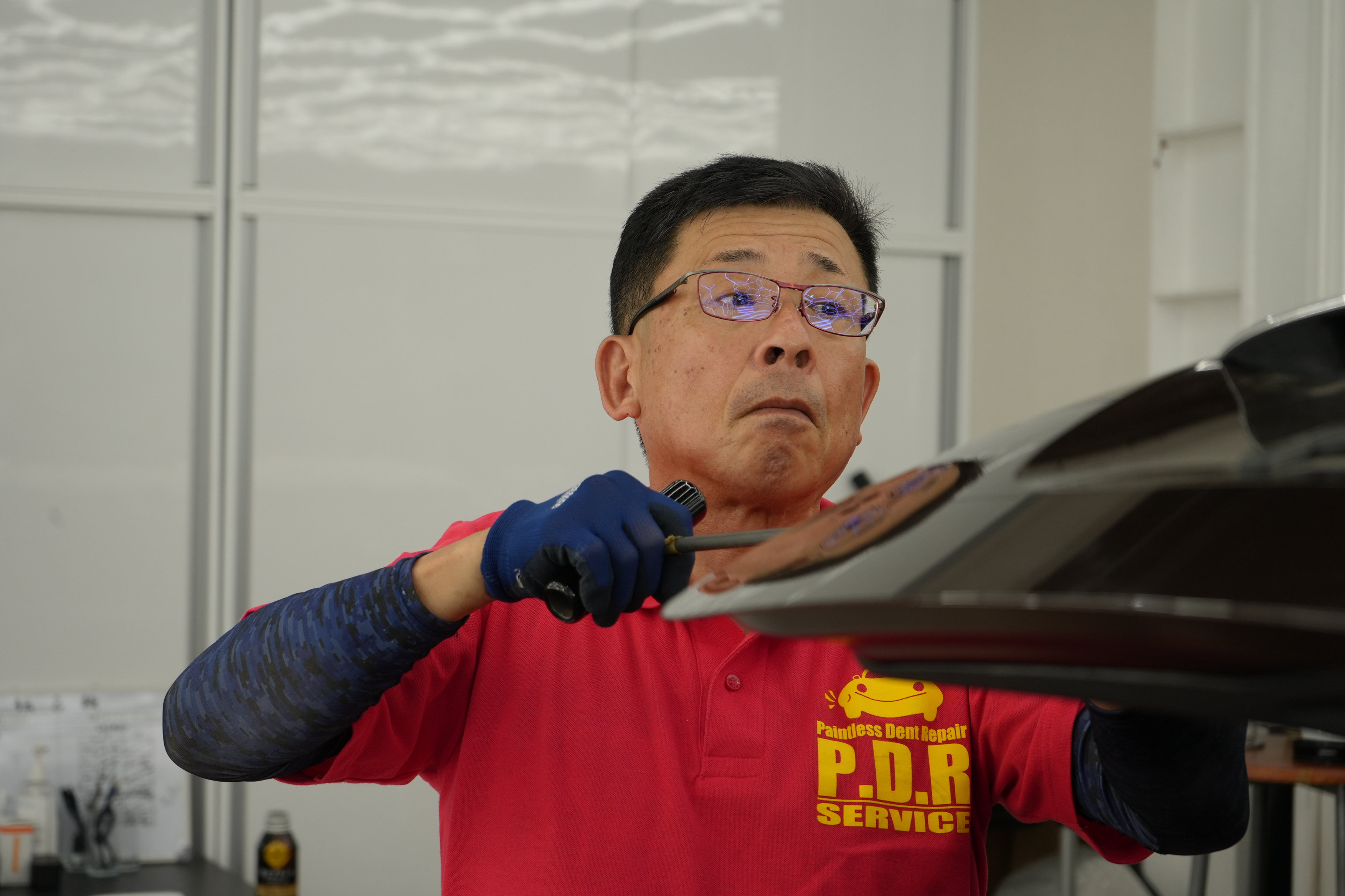 凹みを裏側から専用特殊工具で丁寧に押し戻すことにより、歪みまでコンロトールしとても早く綺麗に直せるのが特徴です。塗装しないで修復することにより、とても早く綺麗に、そしてお安くご提供することが出来ます。